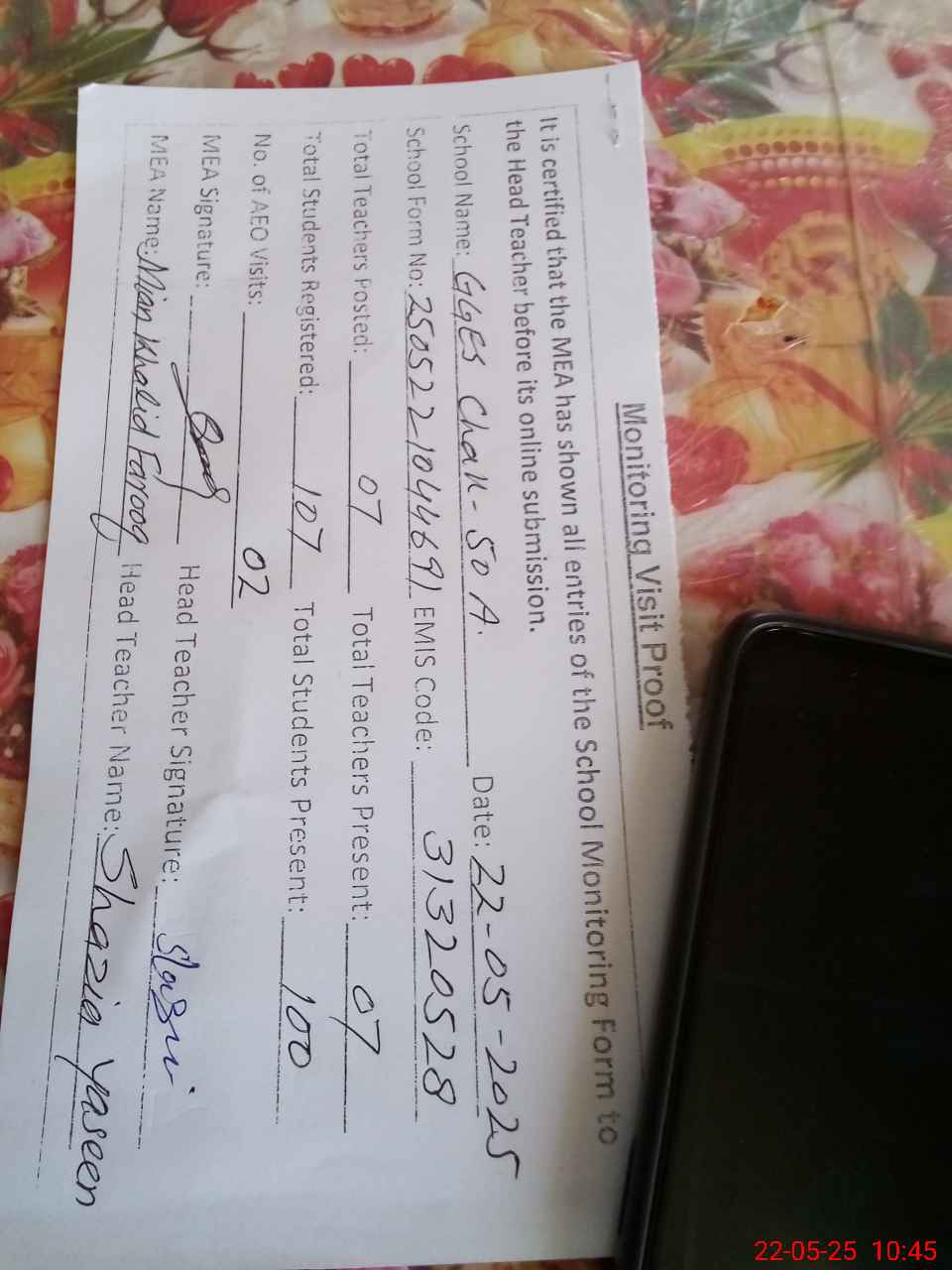 | Attendance Register | Head Teacher | MEA with School | Visit Proof |