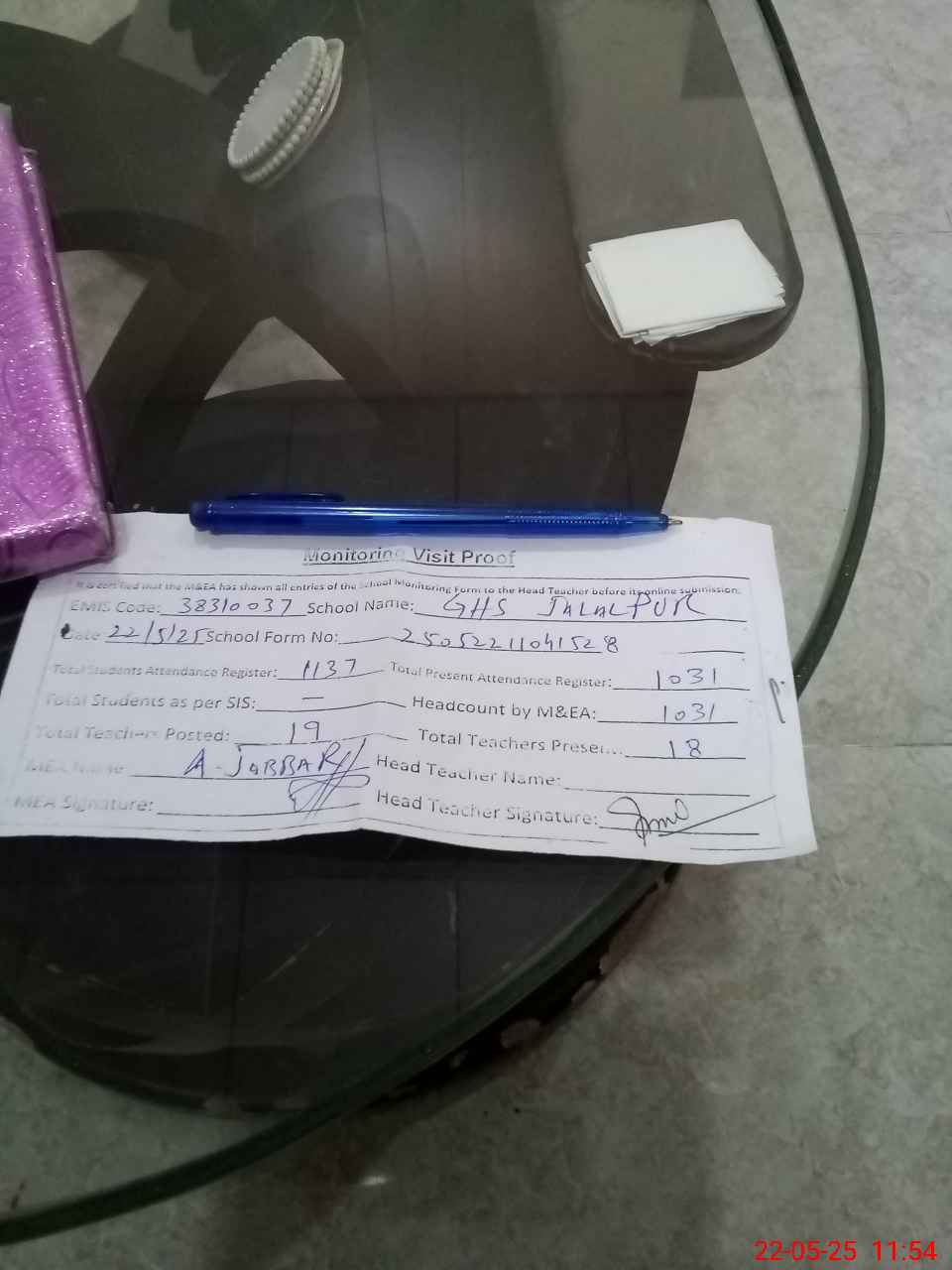 | Attendance Register | Head Teacher | MEA with School | Visit Proof |