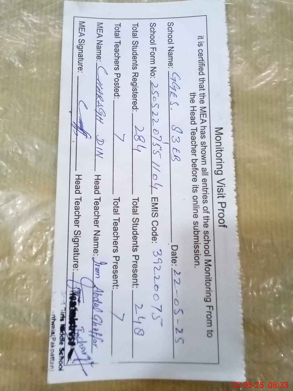 | Attendance Register | Head Teacher | MEA with School | Visit Proof |