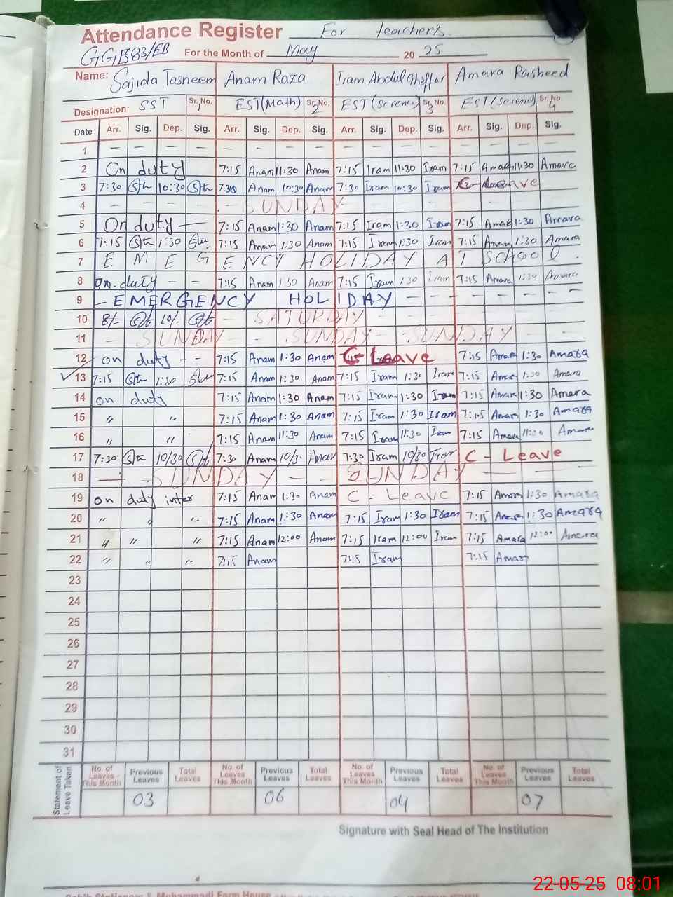 | 36**** | Sa**** Ta**** | Regular | 2 | 19 | 0 | 0 | 0 | 0 | 0 | 0 | 2 | Exam Duty | |