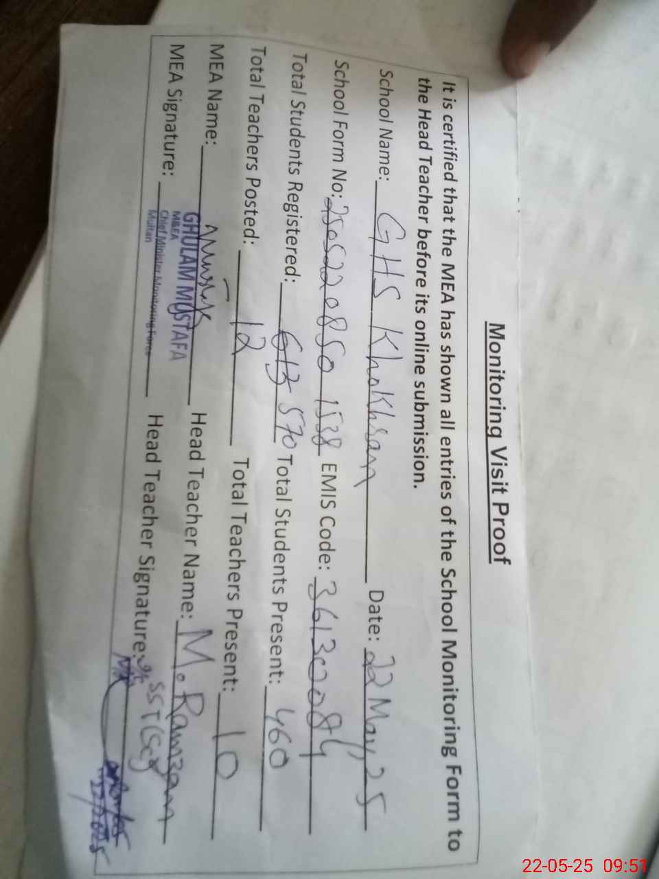 | Attendance Register | Head Teacher | MEA with School | Visit Proof |