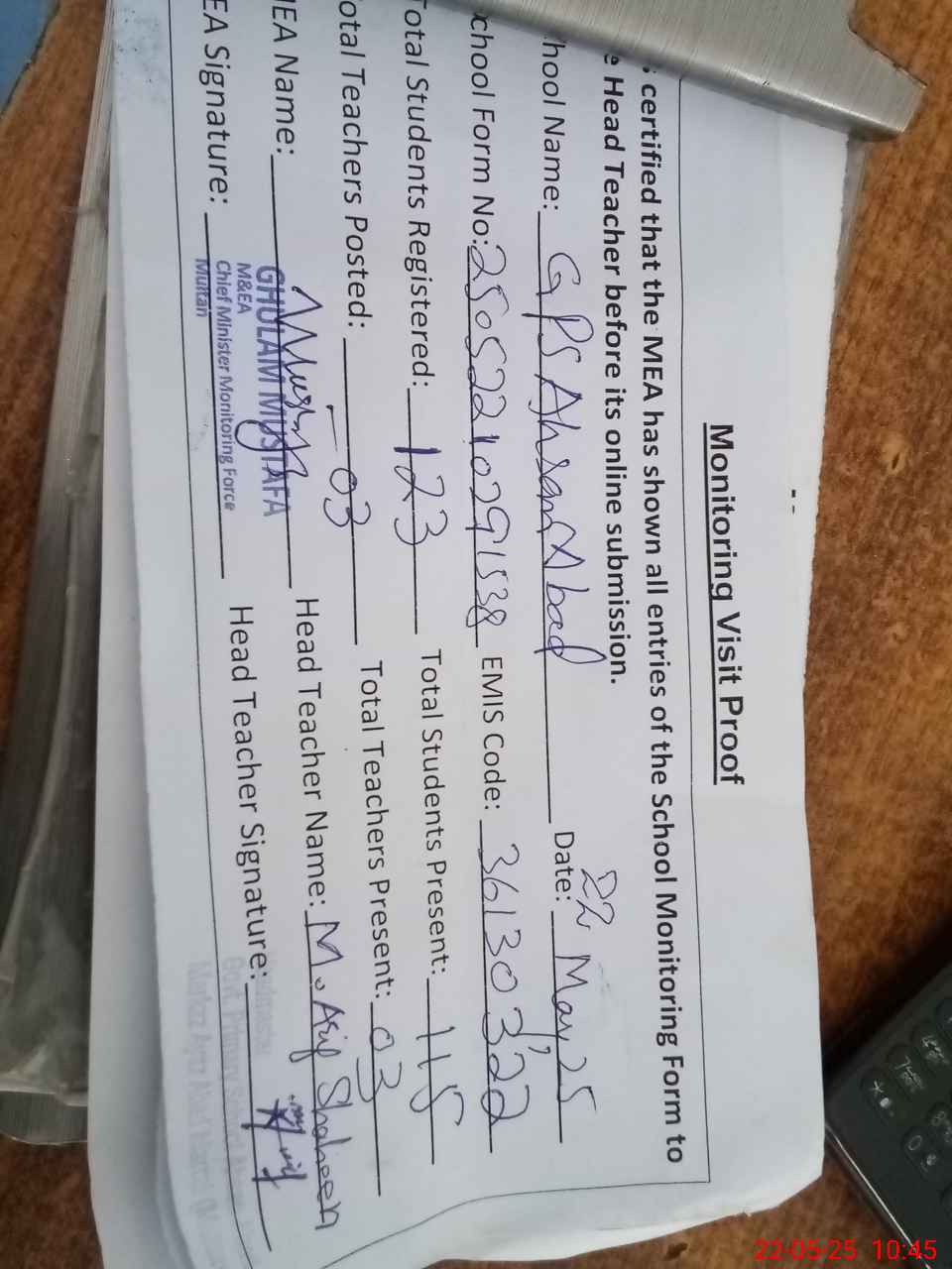 | Name: Mu**** Ar**** Sh**** Designation: (School Headmaster's/Headmistress's) PST Phone/Cell Number: 03**** |
