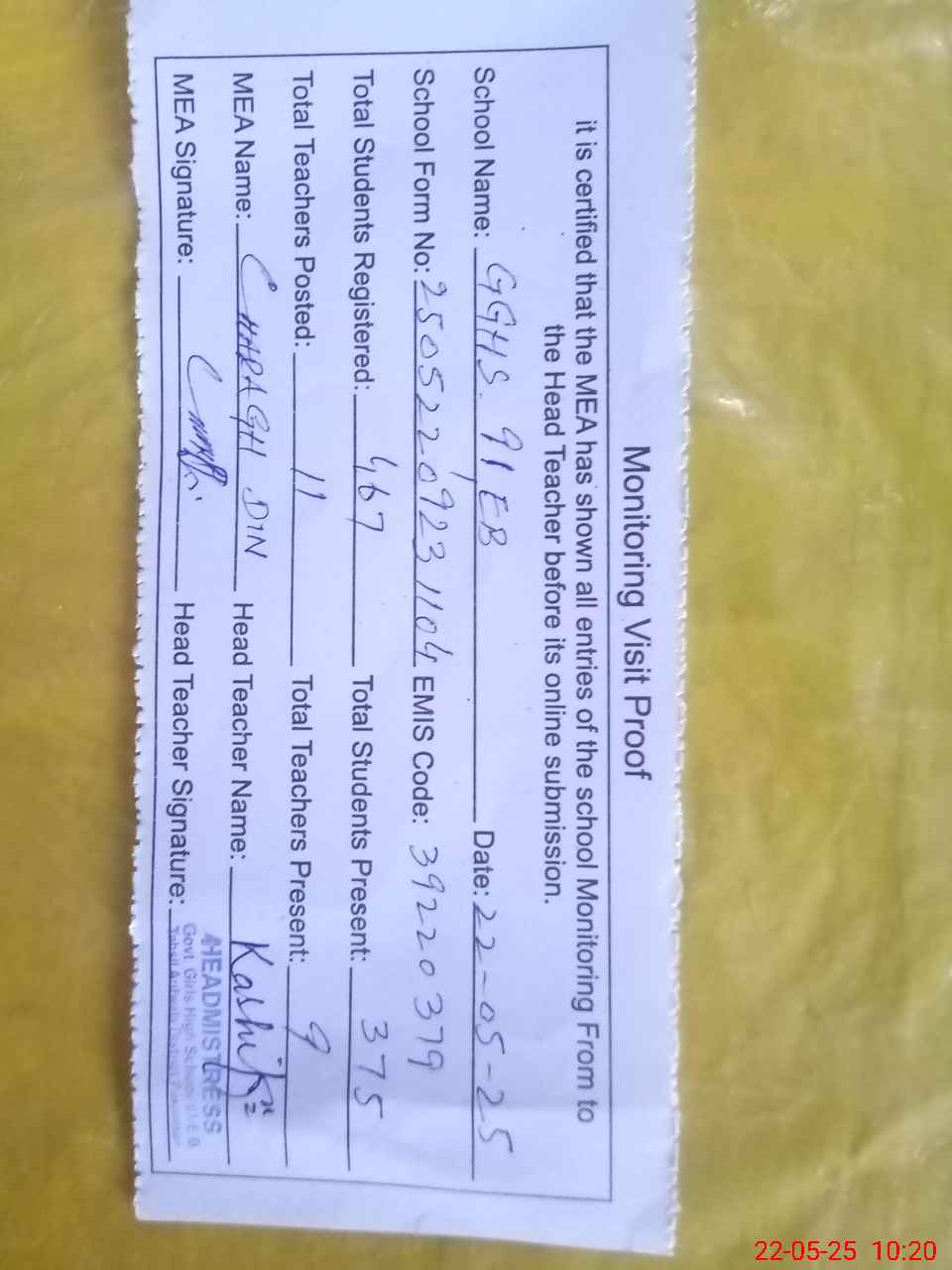 | EMIS Code: 39220379 | Name of School: GGHS 91 EB MOHALAN WALA | |||