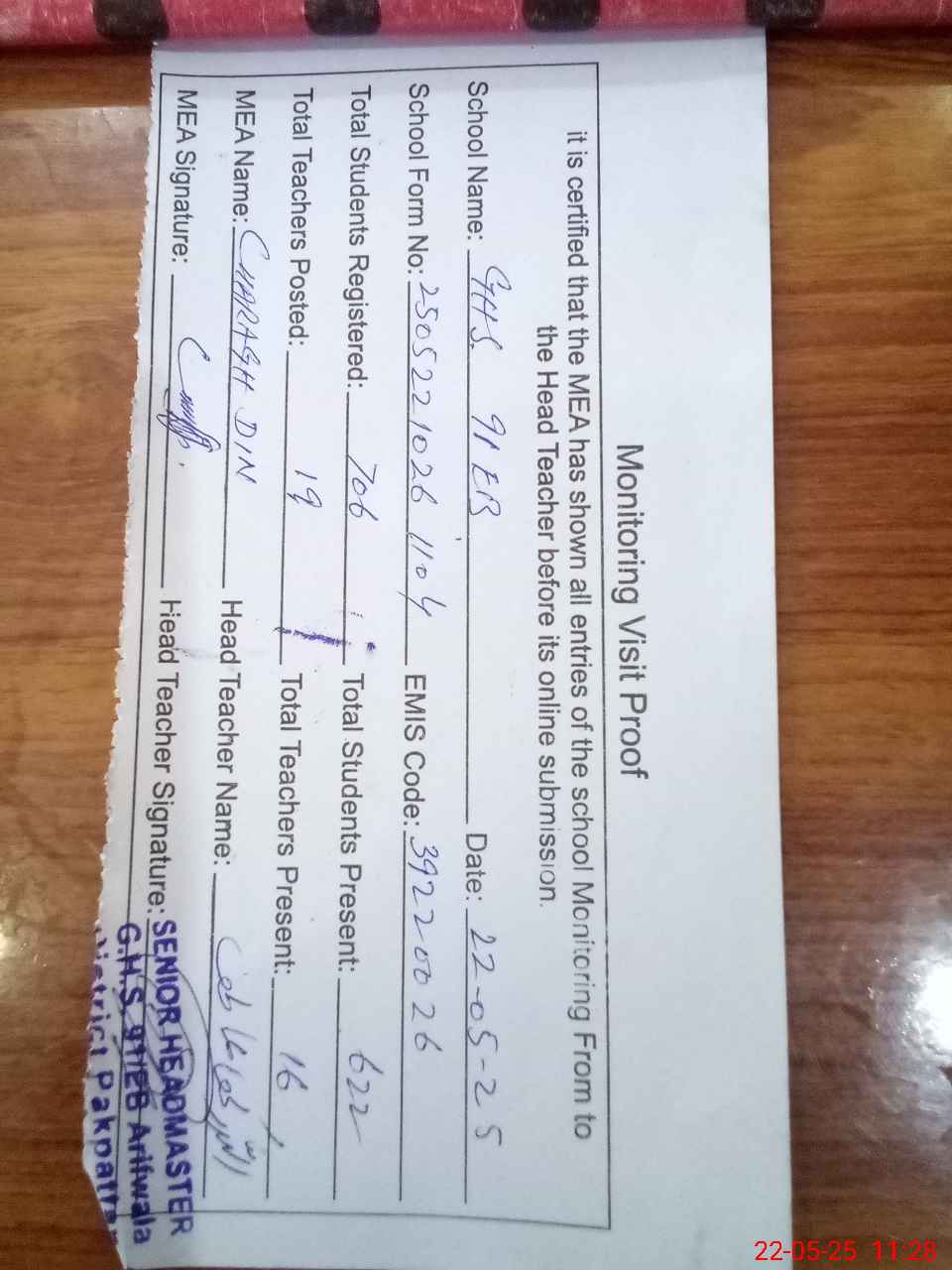 | Attendance Register | Head Teacher | MEA with School | Visit Proof |