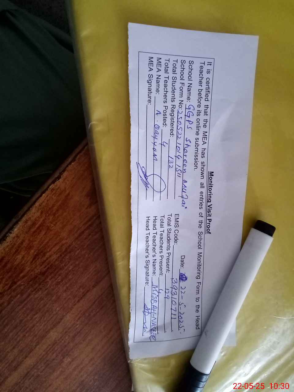 | Attendance Register | Head Teacher | MEA with School | Visit Proof |