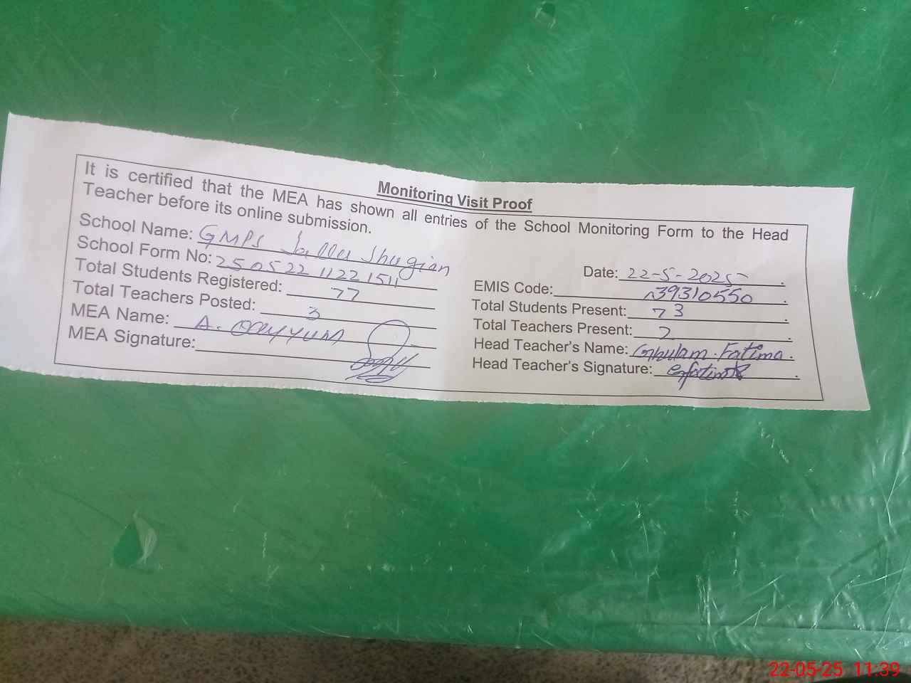 | Attendance Register | Head Teacher | MEA with School | Visit Proof |