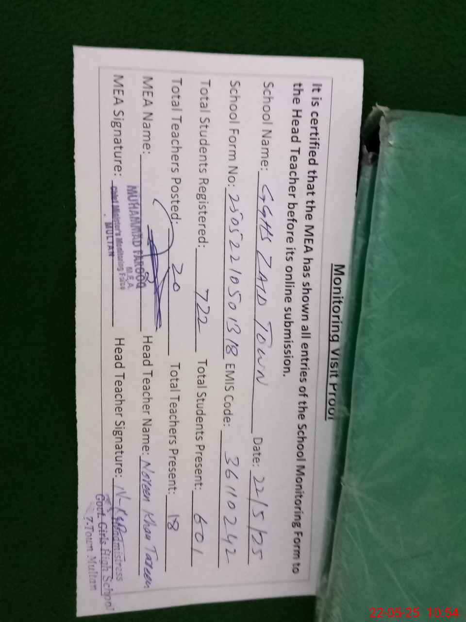 | EMIS Code: 36110242 | Name of School: GGHS ZAID TOWN PHASE NO.2 PIRAN GHAIB ROAD MULTAN | |||