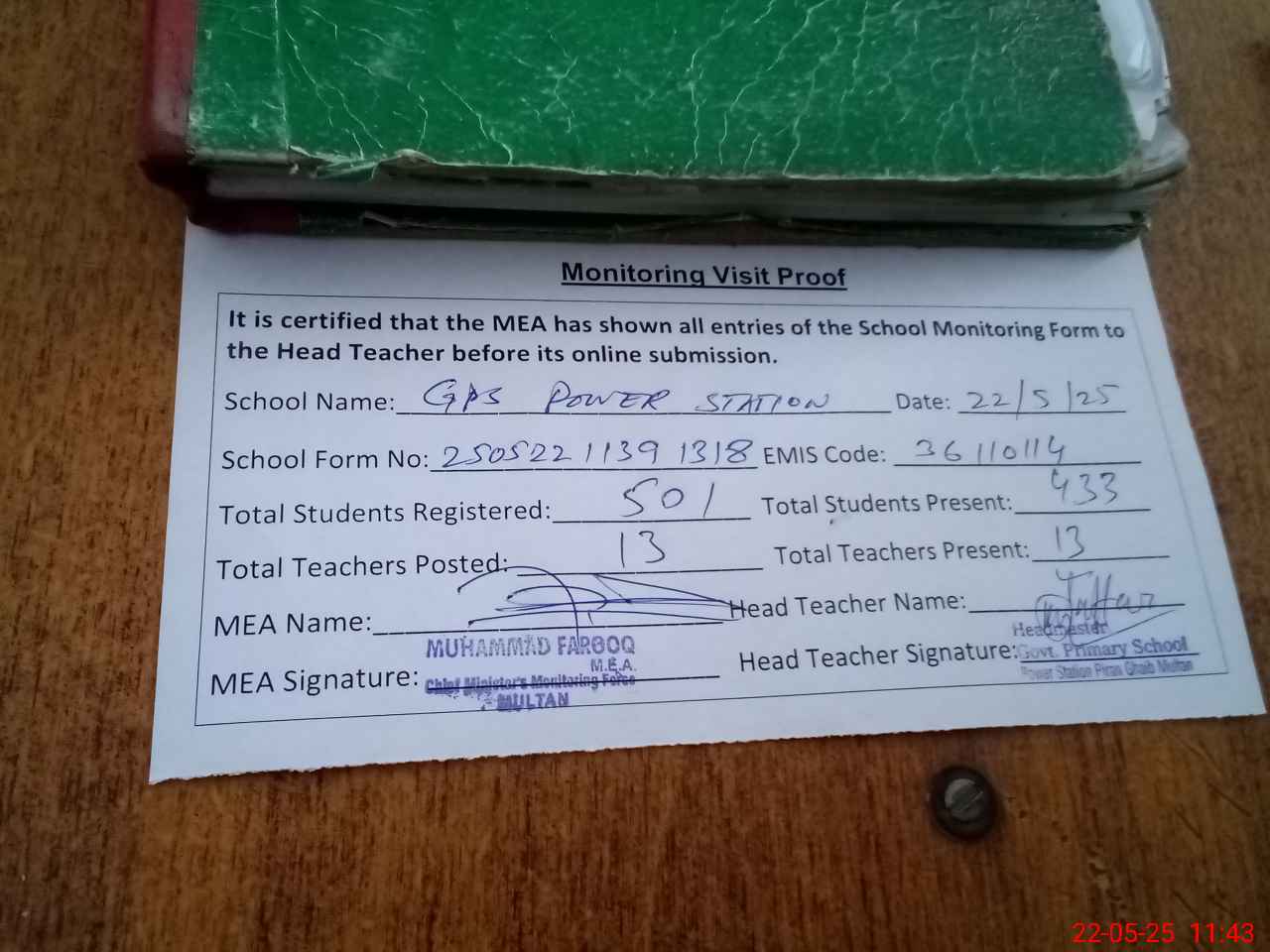 | Attendance Register | Head Teacher | MEA with School | Visit Proof |