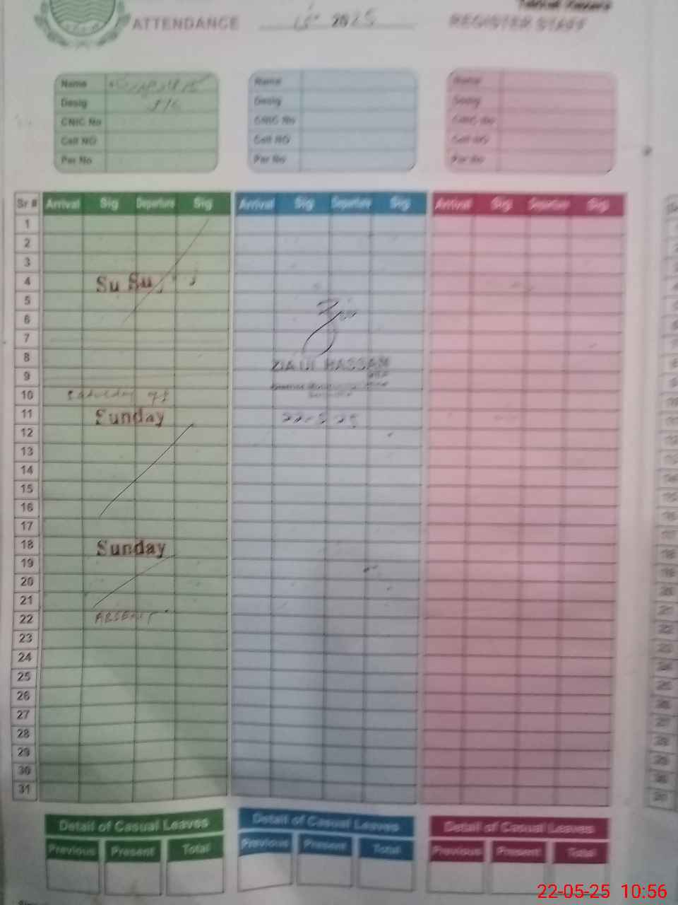 | CNIC | Full Name | Designation | R/C | Absence During Last Calender Month |