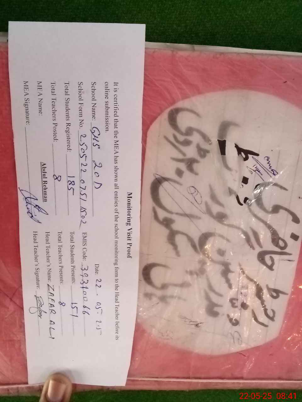 | Certified that this School was Inspected by the Undersigned MEA/DMO Today and the Information Stated Above is as Per Record. | |||||