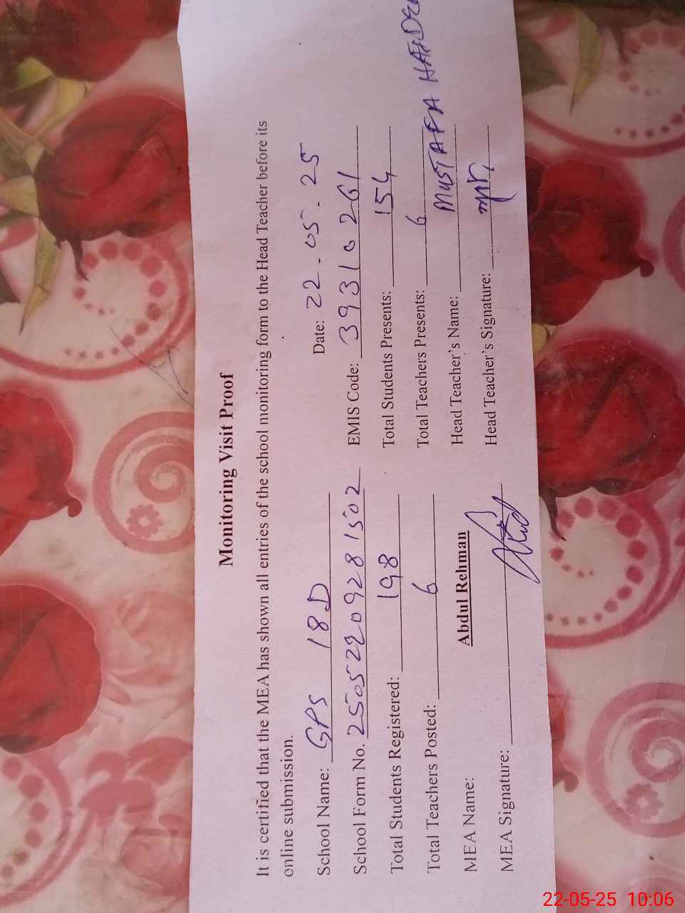| Attendance Register | Head Teacher | MEA with School | Visit Proof |