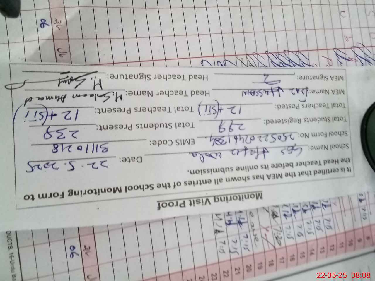 | Attendance Register | Head Teacher | MEA with School | Visit Proof |