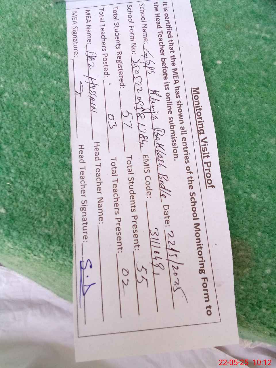 | Attendance Register | Head Teacher | MEA with School | Visit Proof |