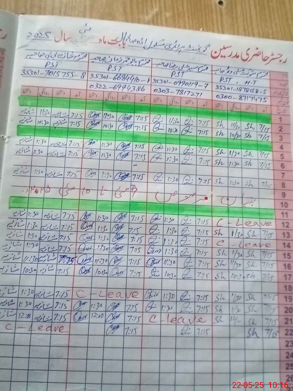 | CNIC | Full Name | Designation | R/C | Absence during last cal. month |
