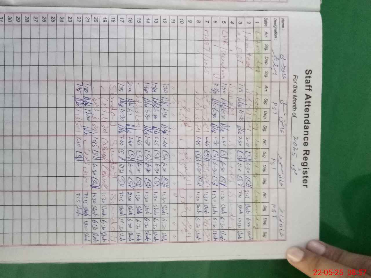 | Remarks (Use Separate Page if Required): Council Meeting not conducted in the month of April 25 PST Kauser Naseem applied Casual leave today but her leave is still waiting for approval till 0938 hours so mark him absent Paint work required 35210869 | |||||