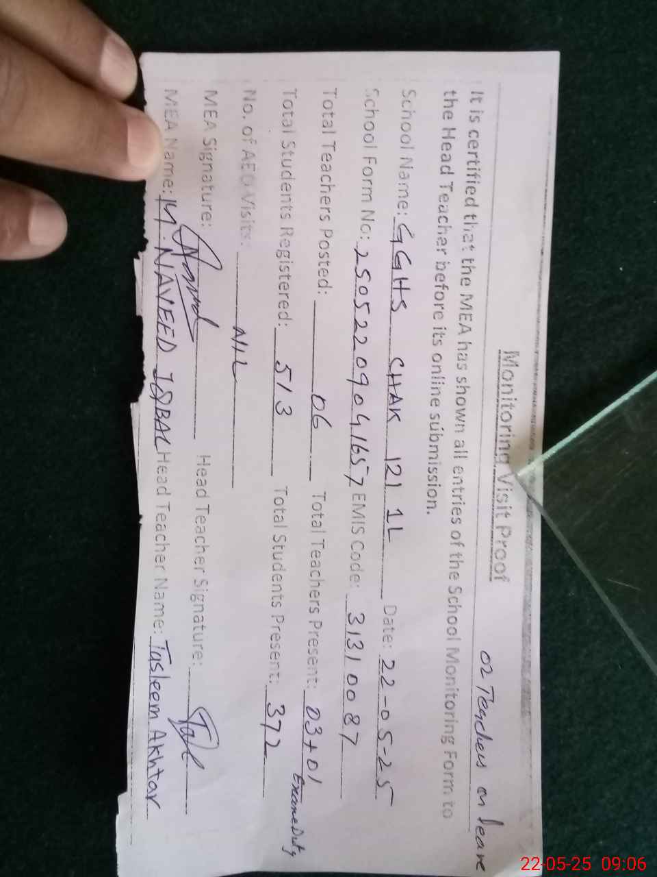 | Attendance Register | Head Teacher | MEA with School | Visit Proof |
