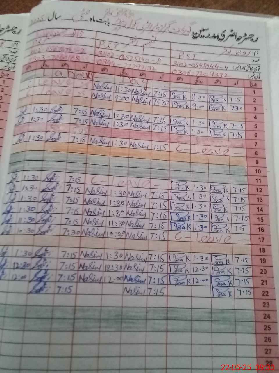 | CNIC | Full Name | Designation | R/C | Absence During Last Calender Month |