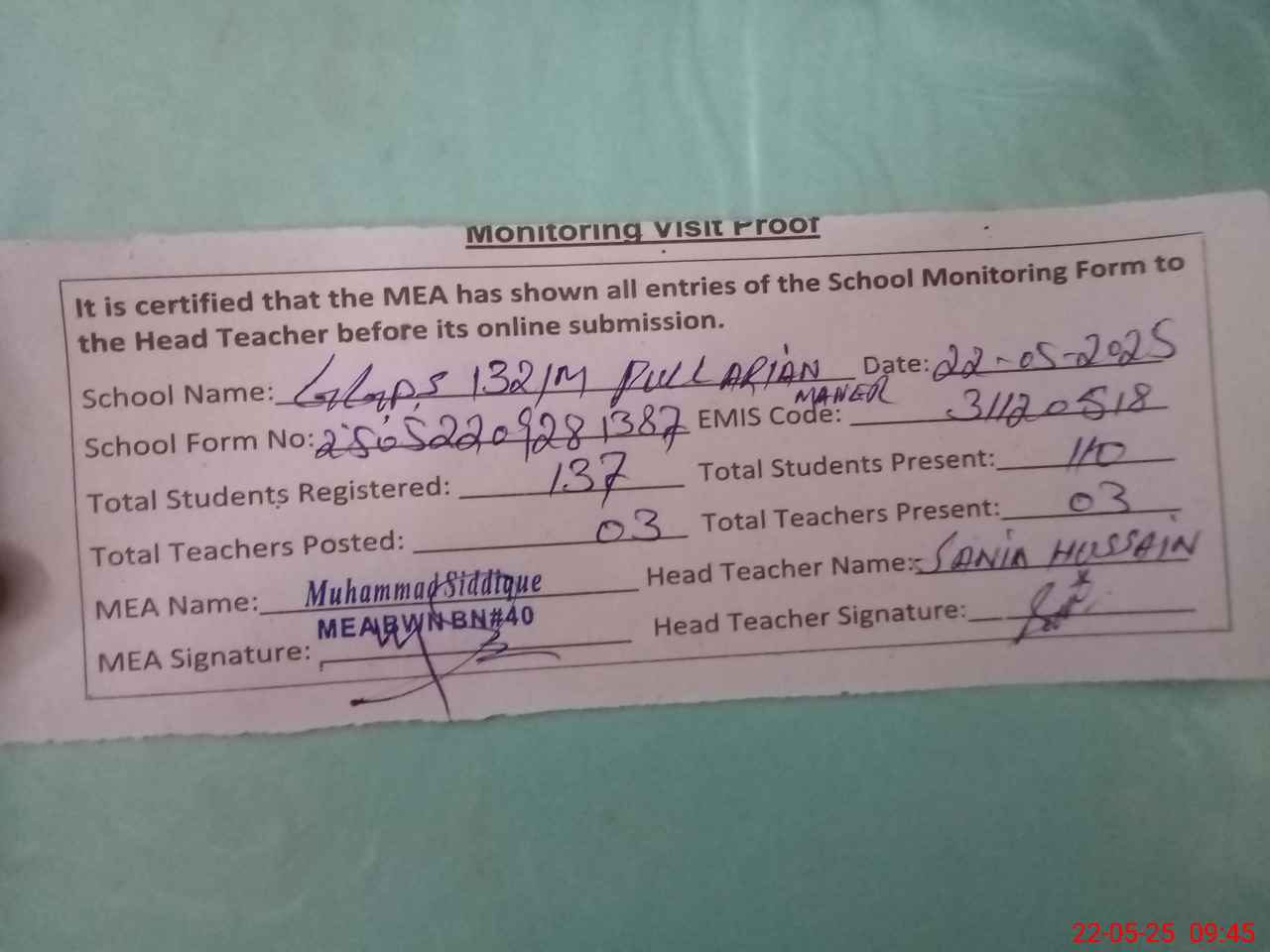 | Attendance Register | Head Teacher | MEA with School | Visit Proof |