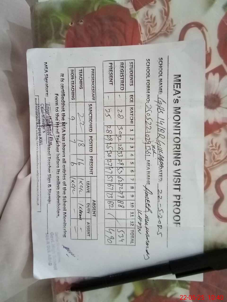 | Certified that this School was Inspected by the Undersigned MEA/DMO Today and the Information Stated Above is as Per Record. | |||||