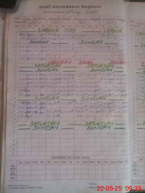 | CNIC | Full Name | Designation | R/C | Absence During Last Calender Month |