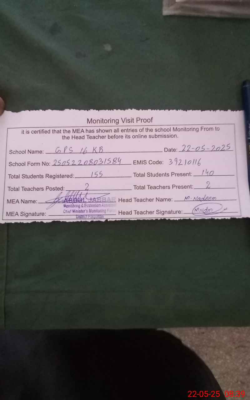 | EMIS Code: 39210116 | Name of School: GPS 16 KB | |||