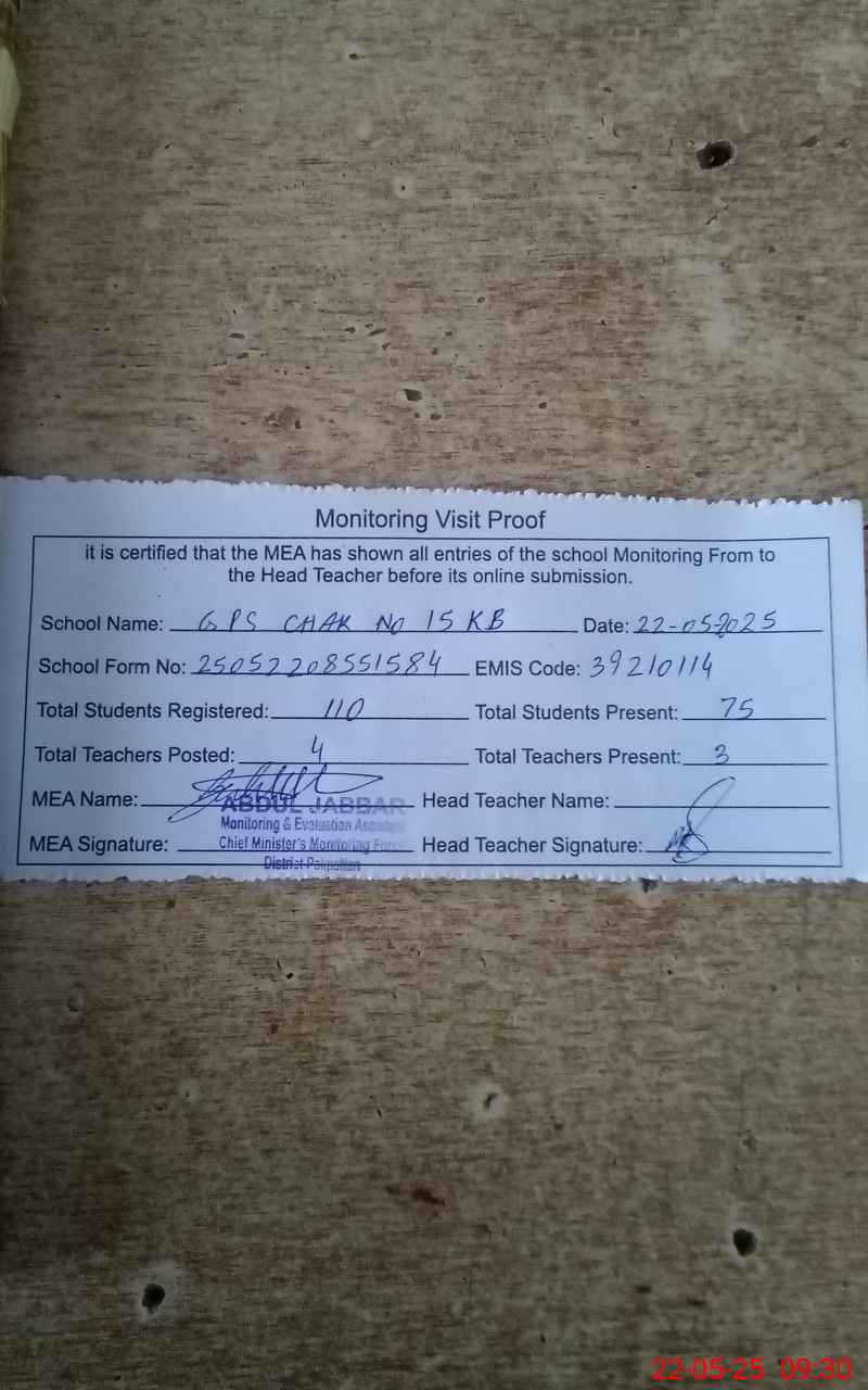 | EMIS Code: 39210114 | Name of School: GPS CHAK NO 15 KB | |||