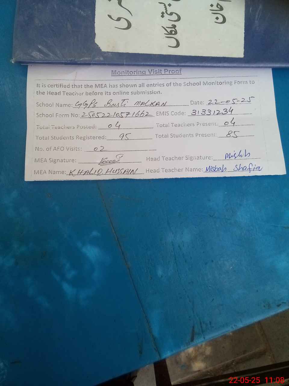 | Attendance Register | Head Teacher | MEA with School | Visit Proof |