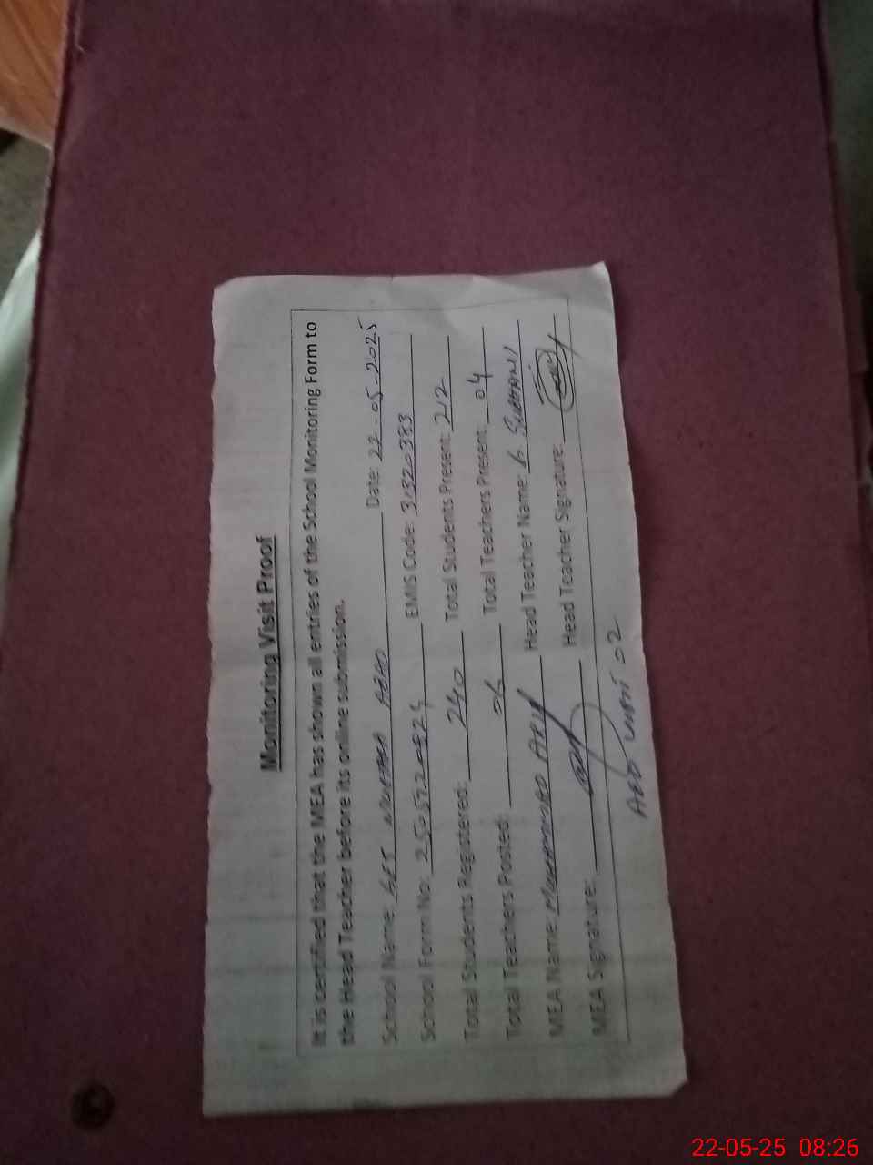 | Attendance Register | Head Teacher | MEA with School | Visit Proof |