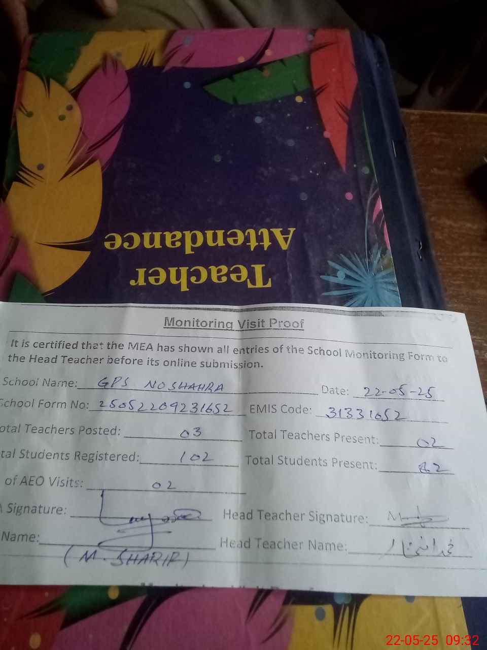 | Attendance Register | Head Teacher | MEA with School | Visit Proof |