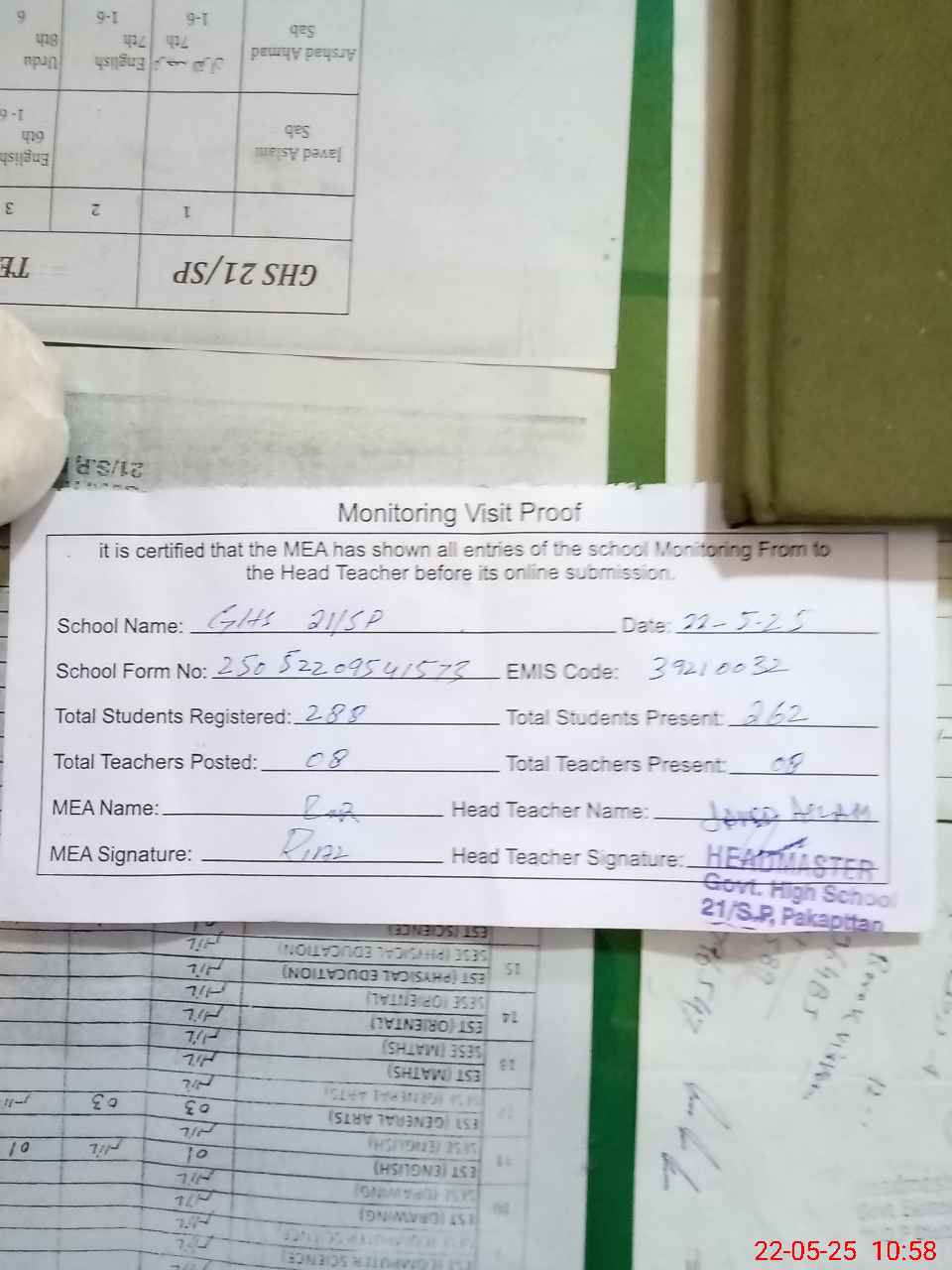 | Attendance Register | Head Teacher | MEA with School | Visit Proof |