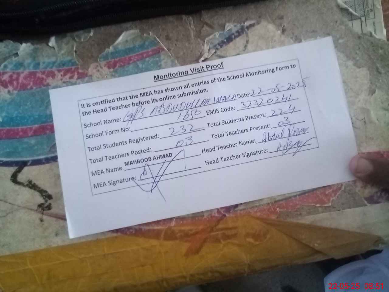 | Attendance Register | Head Teacher | MEA with School | Visit Proof |