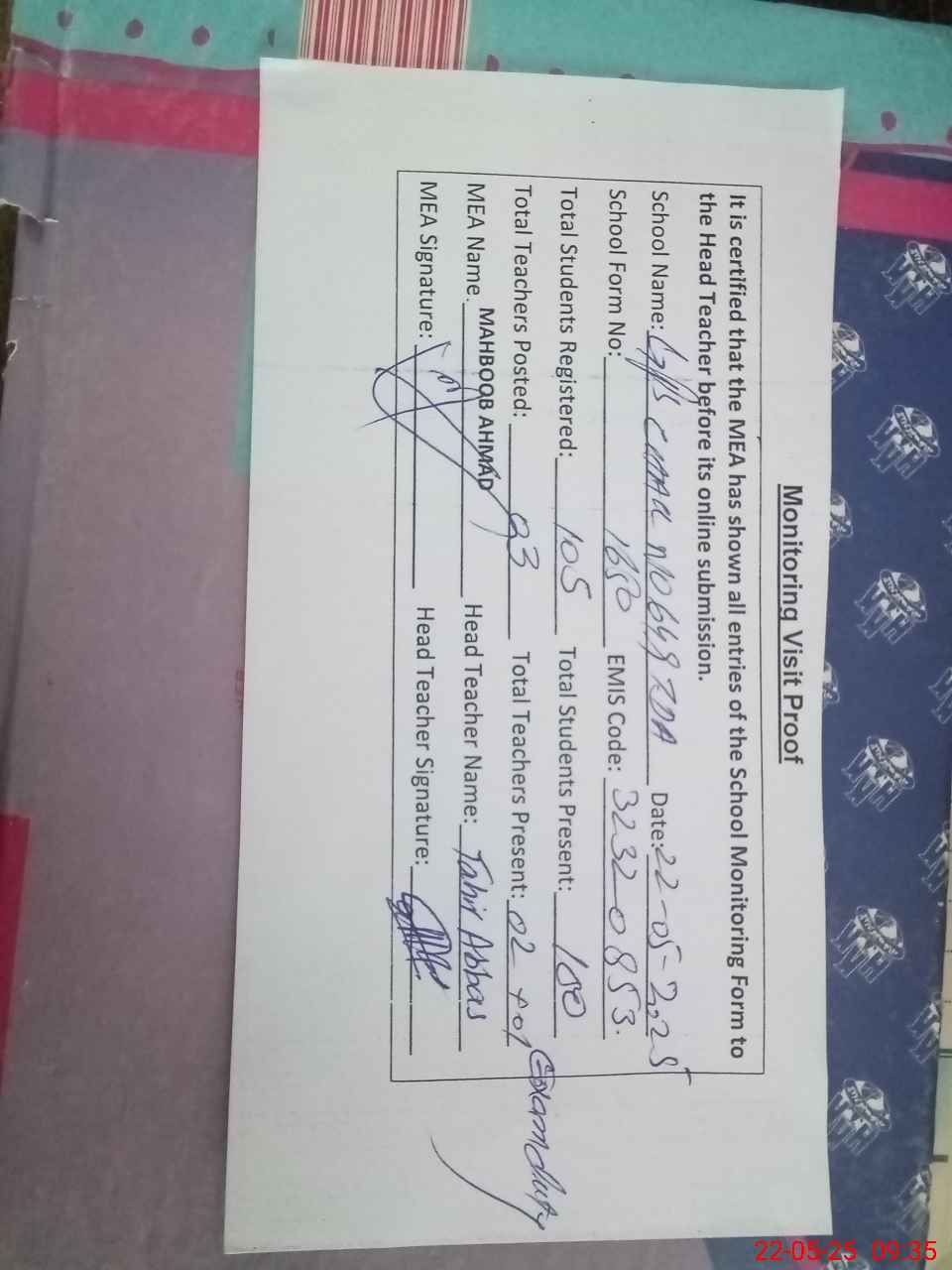 | Certified that this School was Inspected by the Undersigned MEA/DMO Today and the Information Stated Above is as Per Record. | |||||