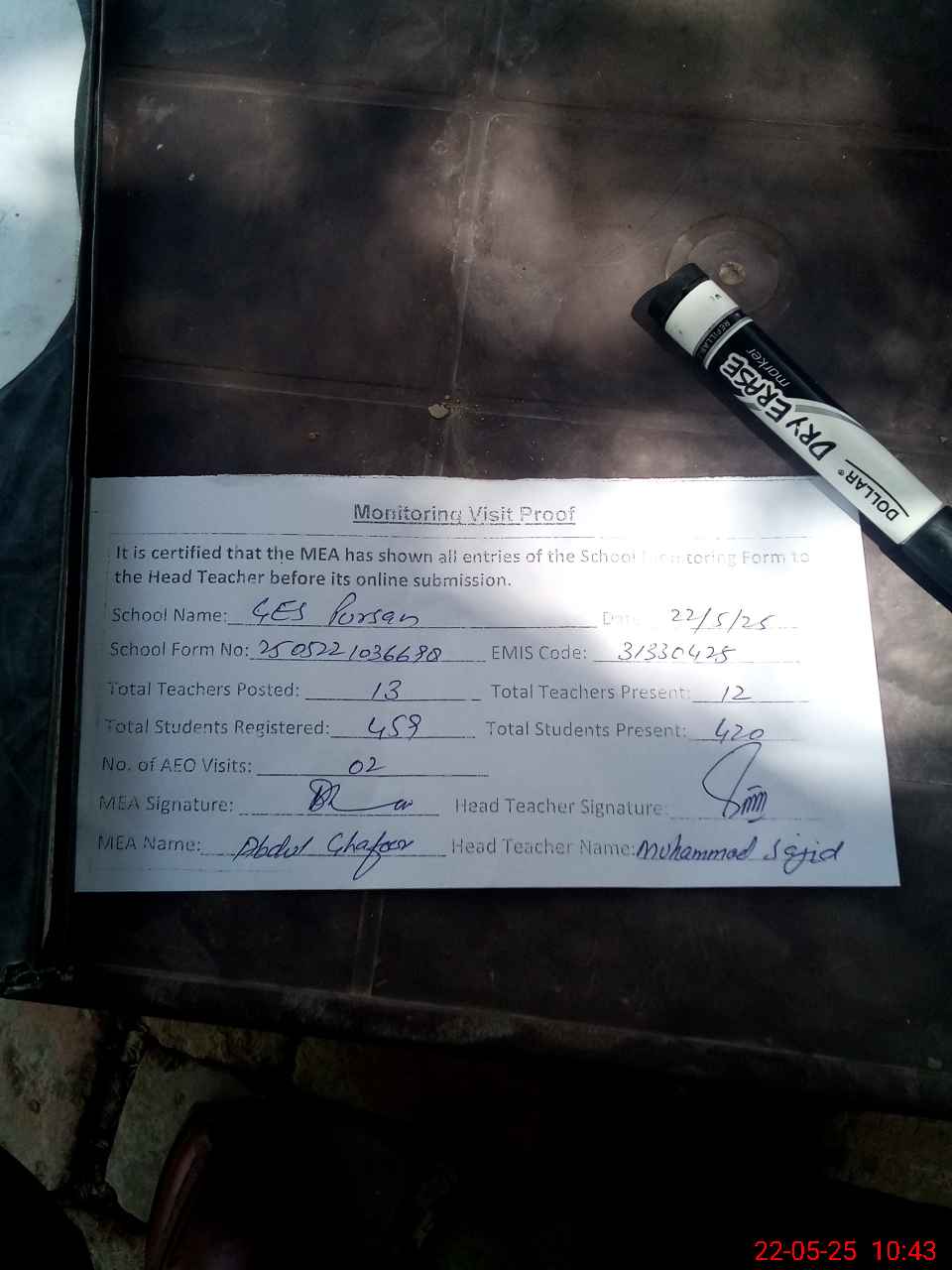 | Attendance Register | Head Teacher | MEA with School | Visit Proof |