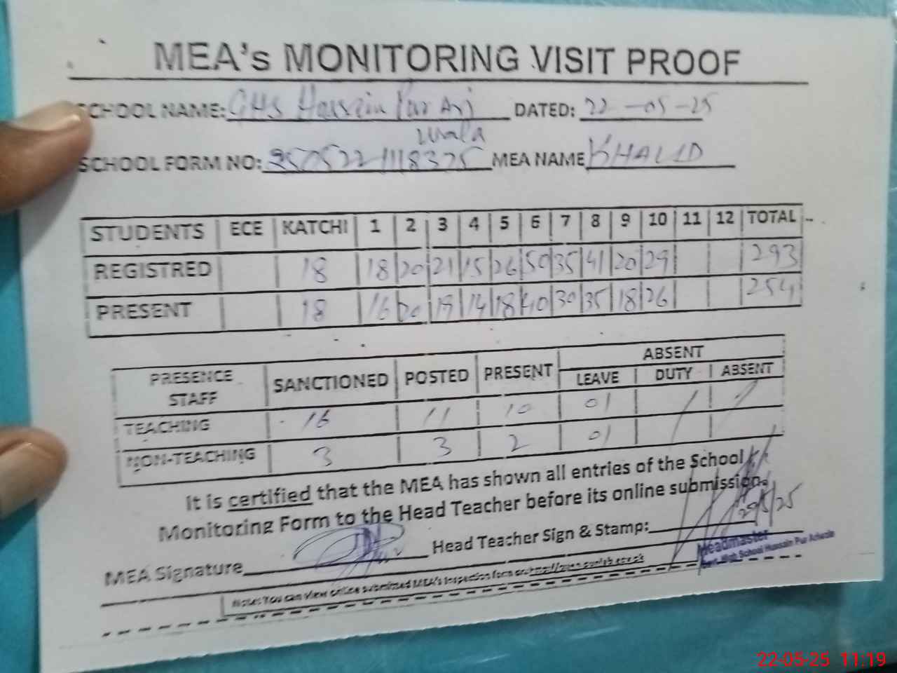 | Attendance Register | Head Teacher | MEA with School | Visit Proof |