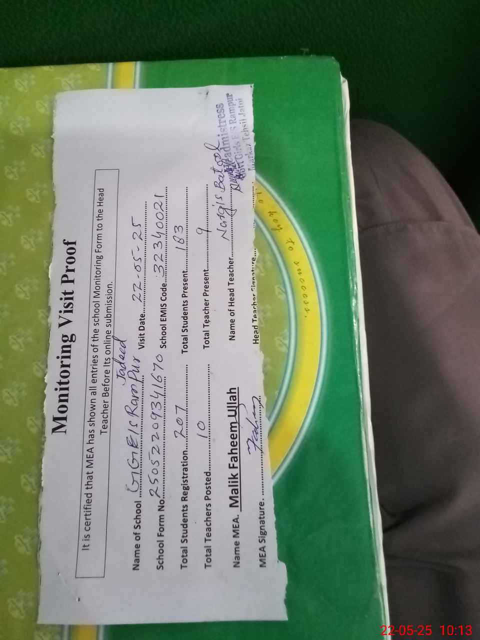 | Name: Az**** Pe**** Designation: (School Headmaster's/Headmistress's) EsT Phone/Cell Number: 03**** |