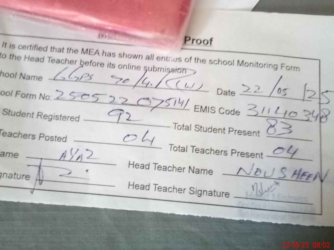 | Attendance Register | Head Teacher | MEA with School | Visit Proof |