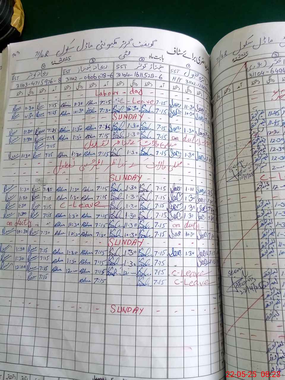 | Remarks (Use Separate Page if Required): Pst Saima Sajjad absent since 2022 She is in Spain Needs department action Afternoon school record not available as classes off | |||||