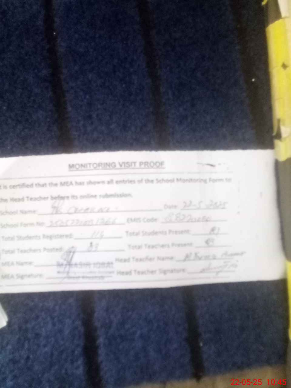 | Attendance Register | Head Teacher | MEA with School | Visit Proof |