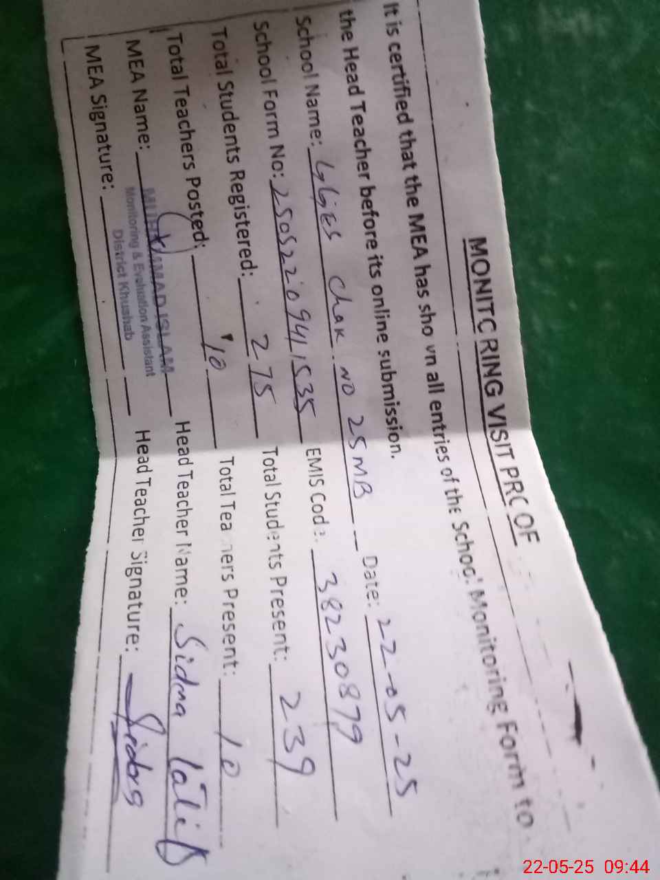 | Attendance Register | Head Teacher | MEA with School | Visit Proof |