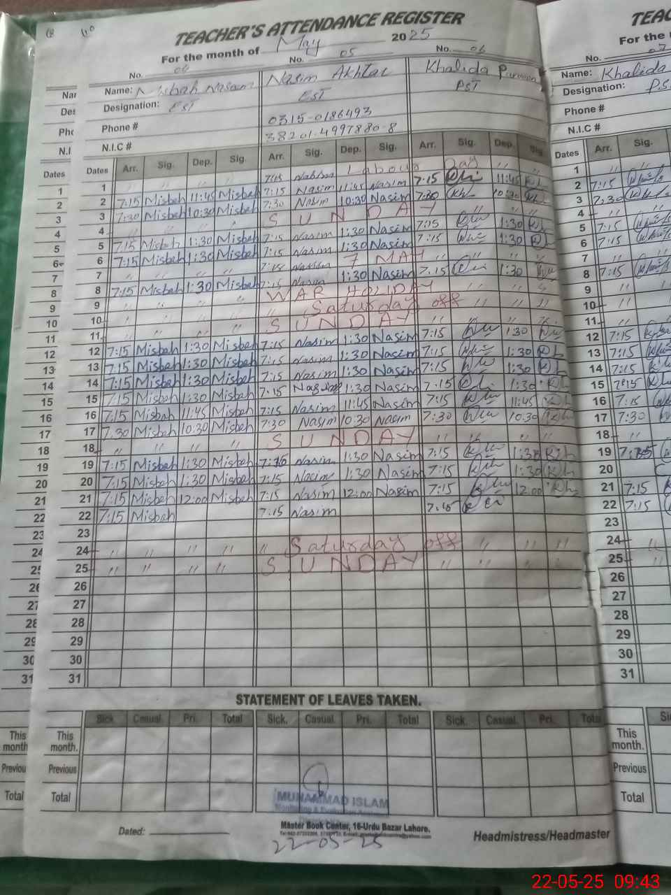| CNIC | Full Name | Designation | R/C | Absence During Last Calender Month |