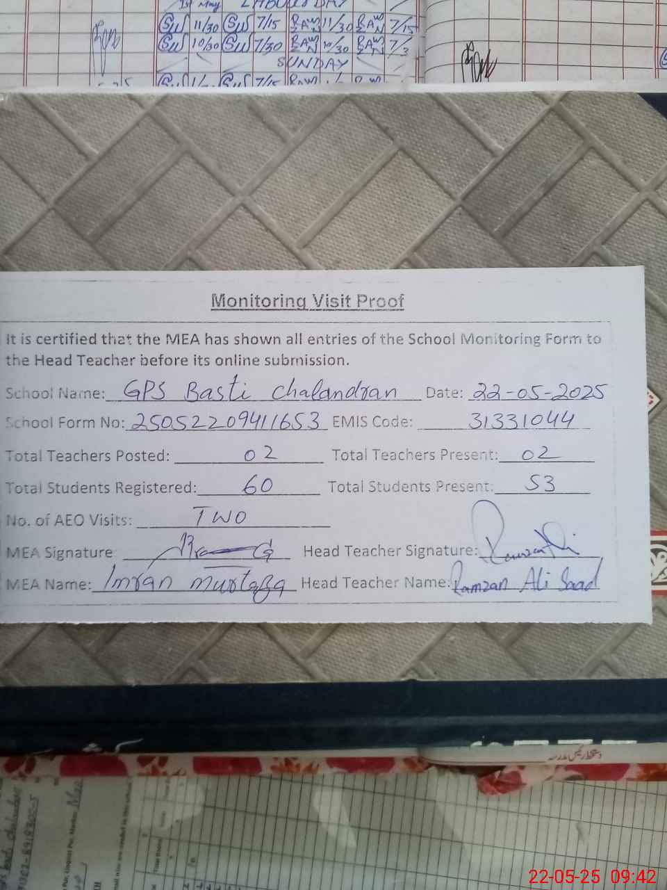 | Attendance Register | Head Teacher | MEA with School | Visit Proof |