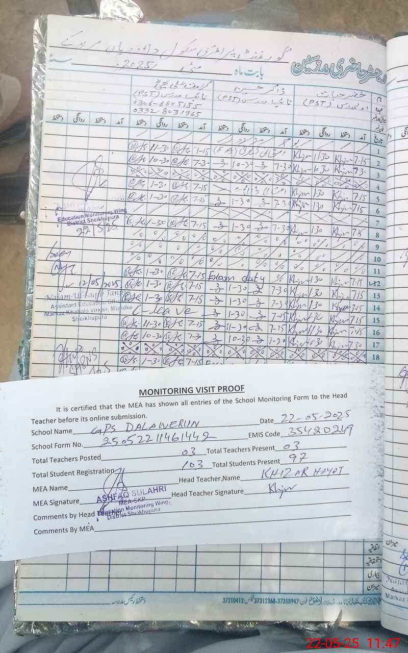 | Attendance Register | Head Teacher | MEA with School | Visit Proof |
