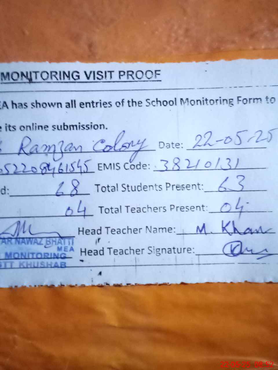 | Attendance Register | Head Teacher | MEA with School | Visit Proof |