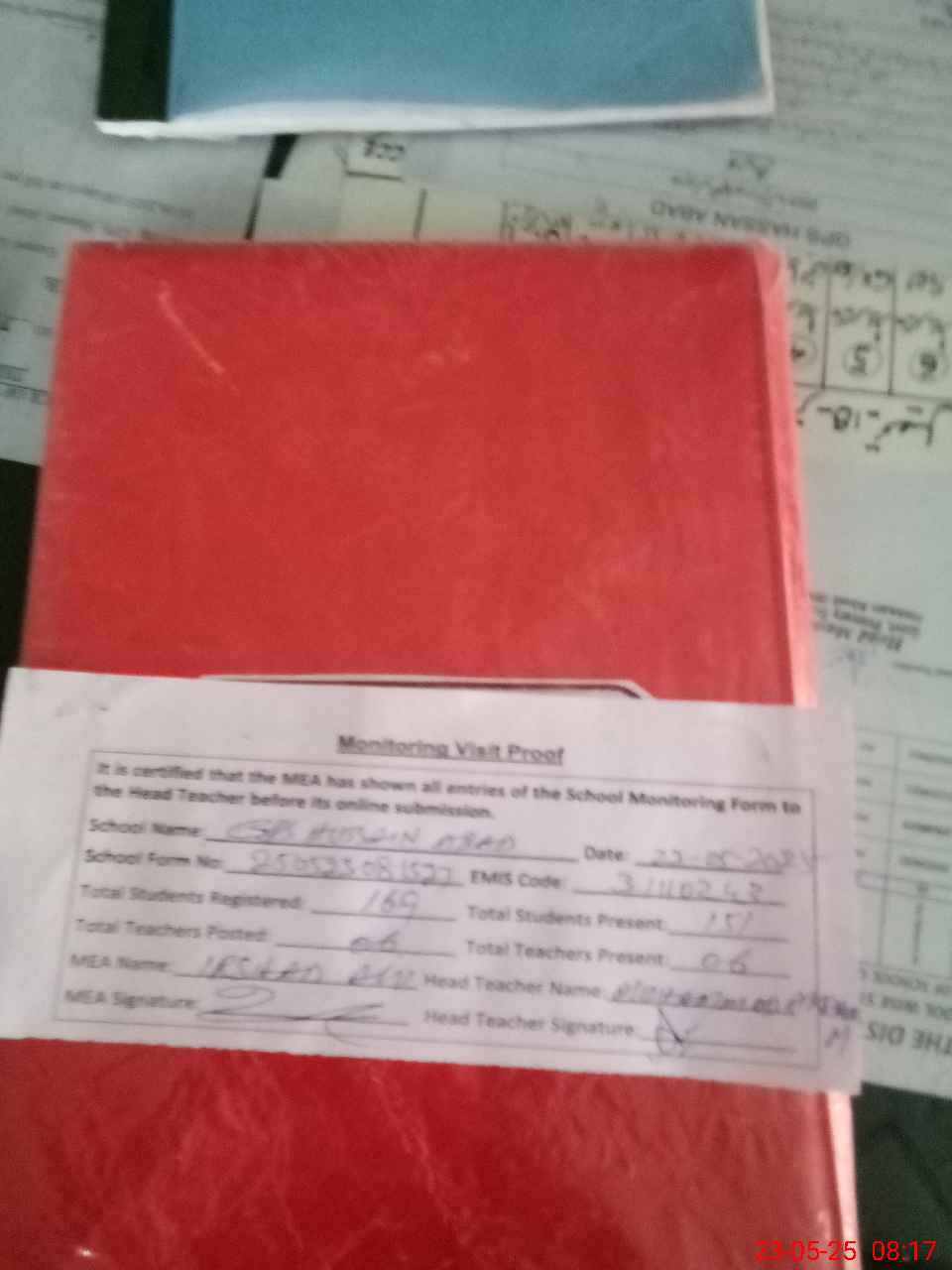| Attendance Register | Head Teacher | MEA with School | Visit Proof |