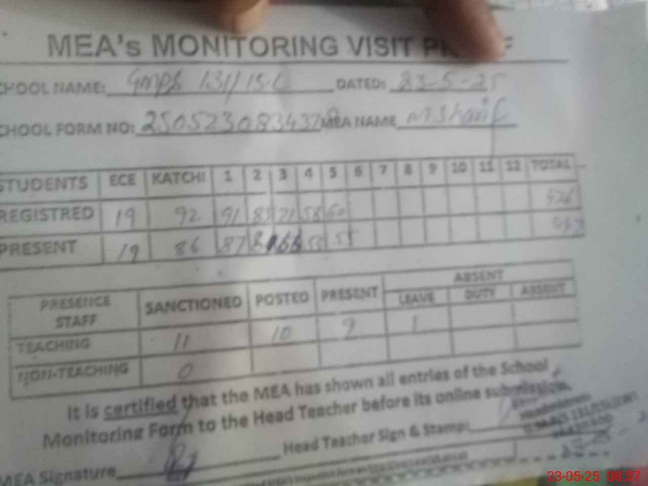 | Attendance Register | Head Teacher | MEA with School | Visit Proof |