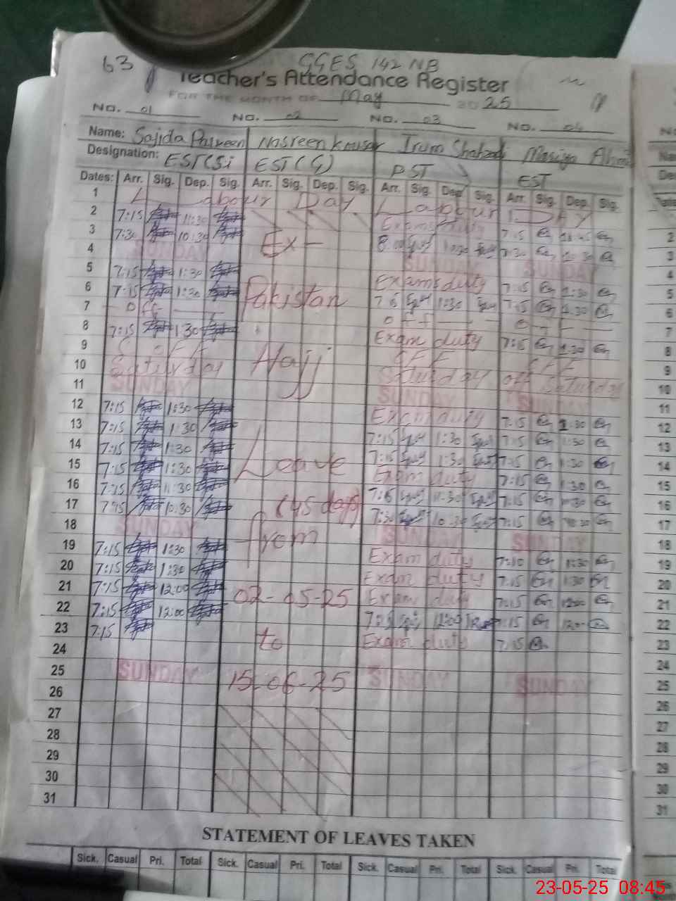 | 38**** | Ir**** Sh**** | PST | Regular | 0 | 5 | 0 | 0 | 0 | 0 | 0 | 0 | 0 | Exam Duty |