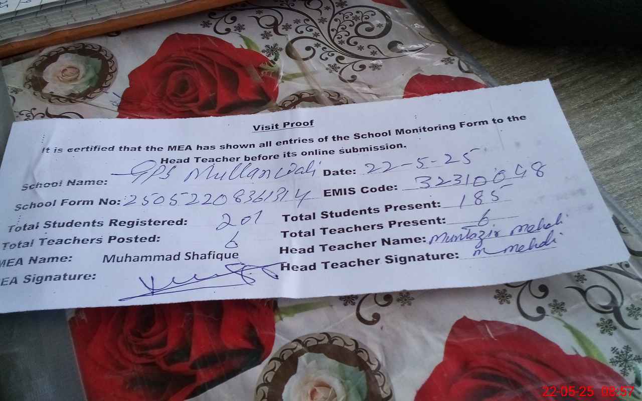 | Attendance Register | Head Teacher | MEA with School | Visit Proof |
