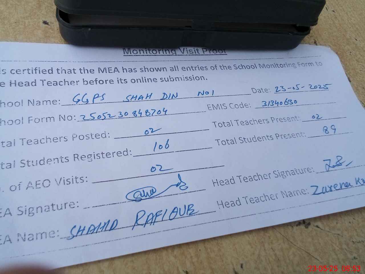 | Attendance Register | Head Teacher | MEA with School | Visit Proof |