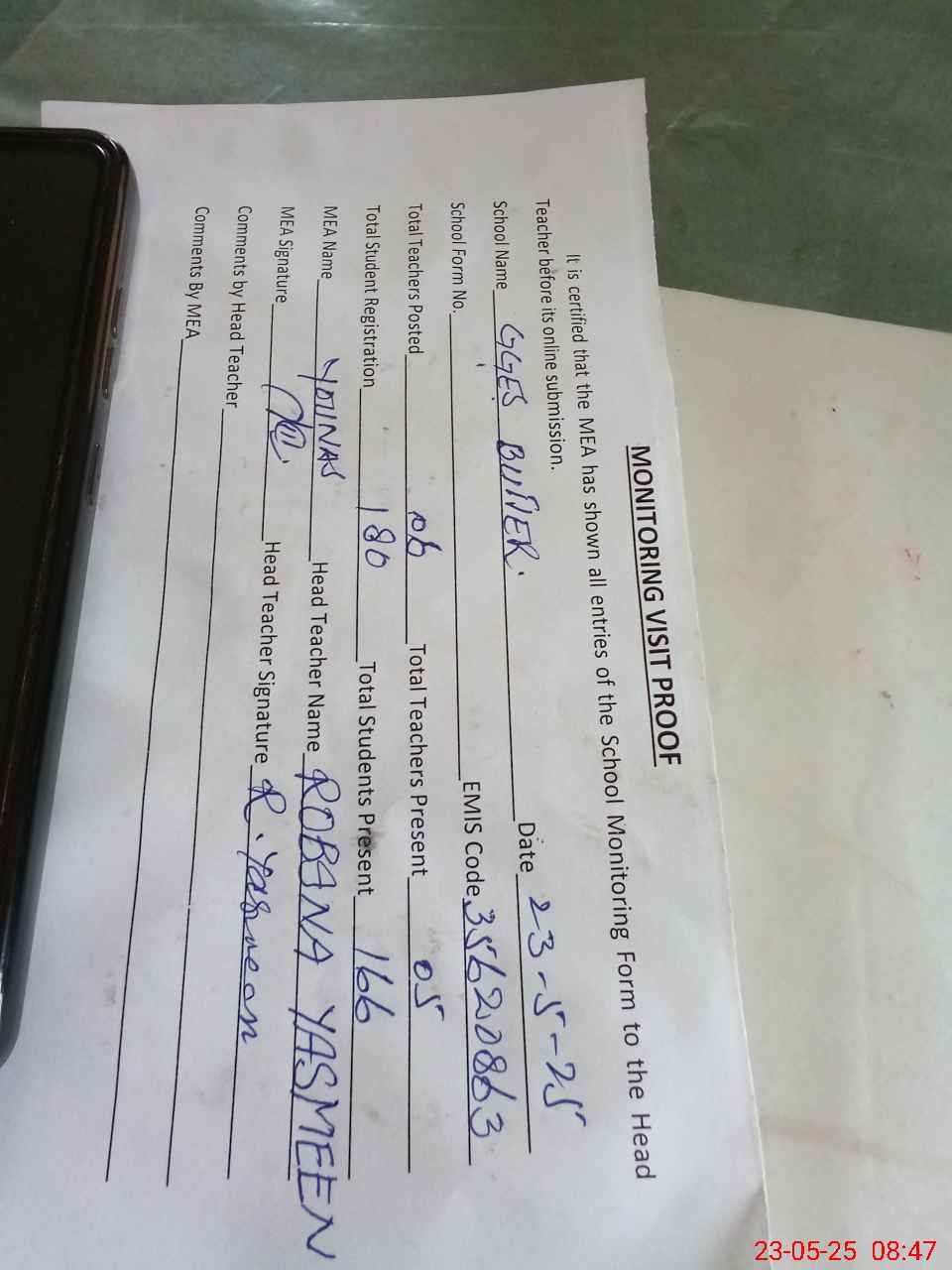 | Attendance Register | Head Teacher | MEA with School | Visit Proof |