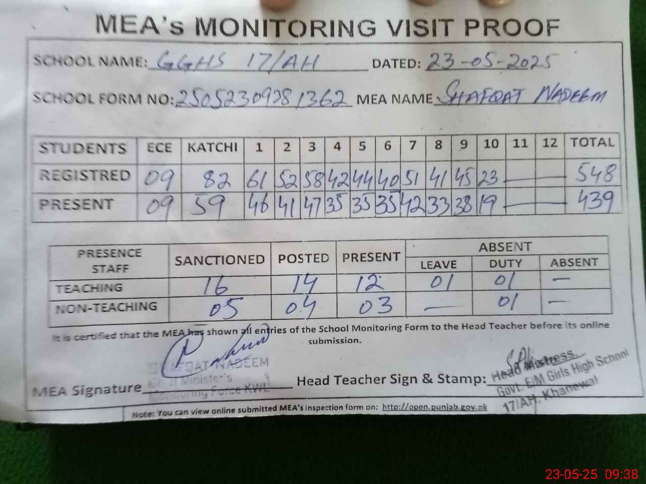 | EMIS Code: 36420107 | Name of School: GGHS 17/AH, KHANEWAL | |||